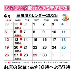※配達、ネットショップ業務等の営業日程は、別の「営業日カレンダー」のページをご参照ください。