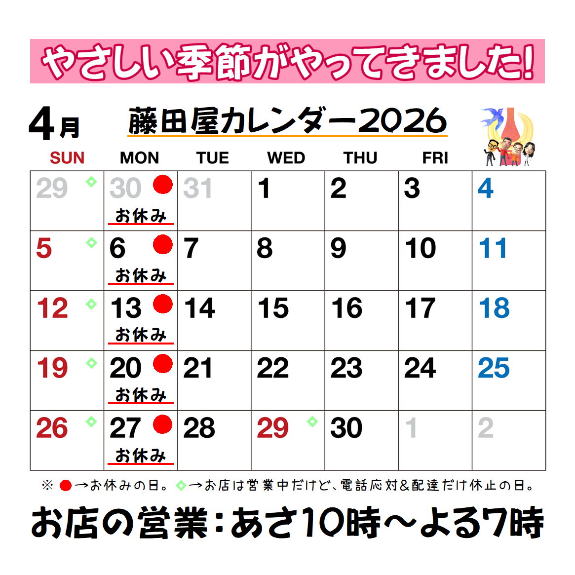 ※配達、ネットショップ業務等の営業日程は、別の「営業日カレンダー」のページをご参照ください。